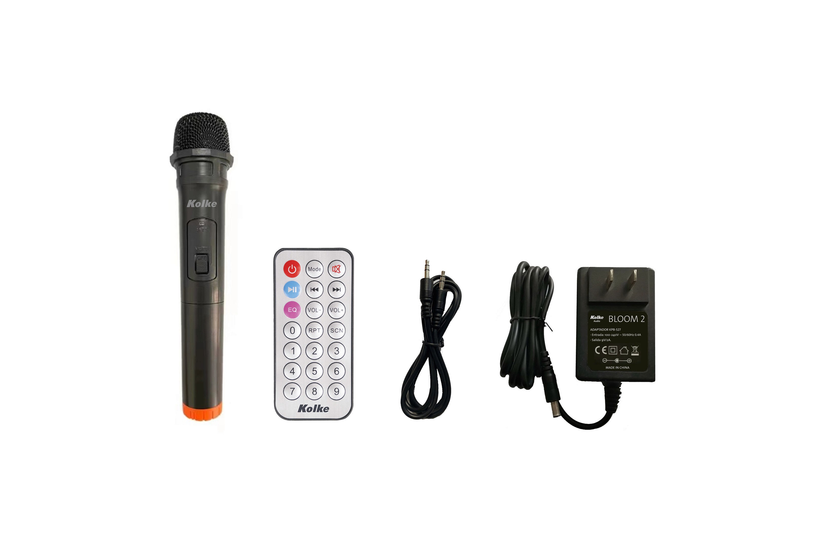 Incluye: Micrófono inalámbrico, Control remoto, Cargador y Cable auxiliar.