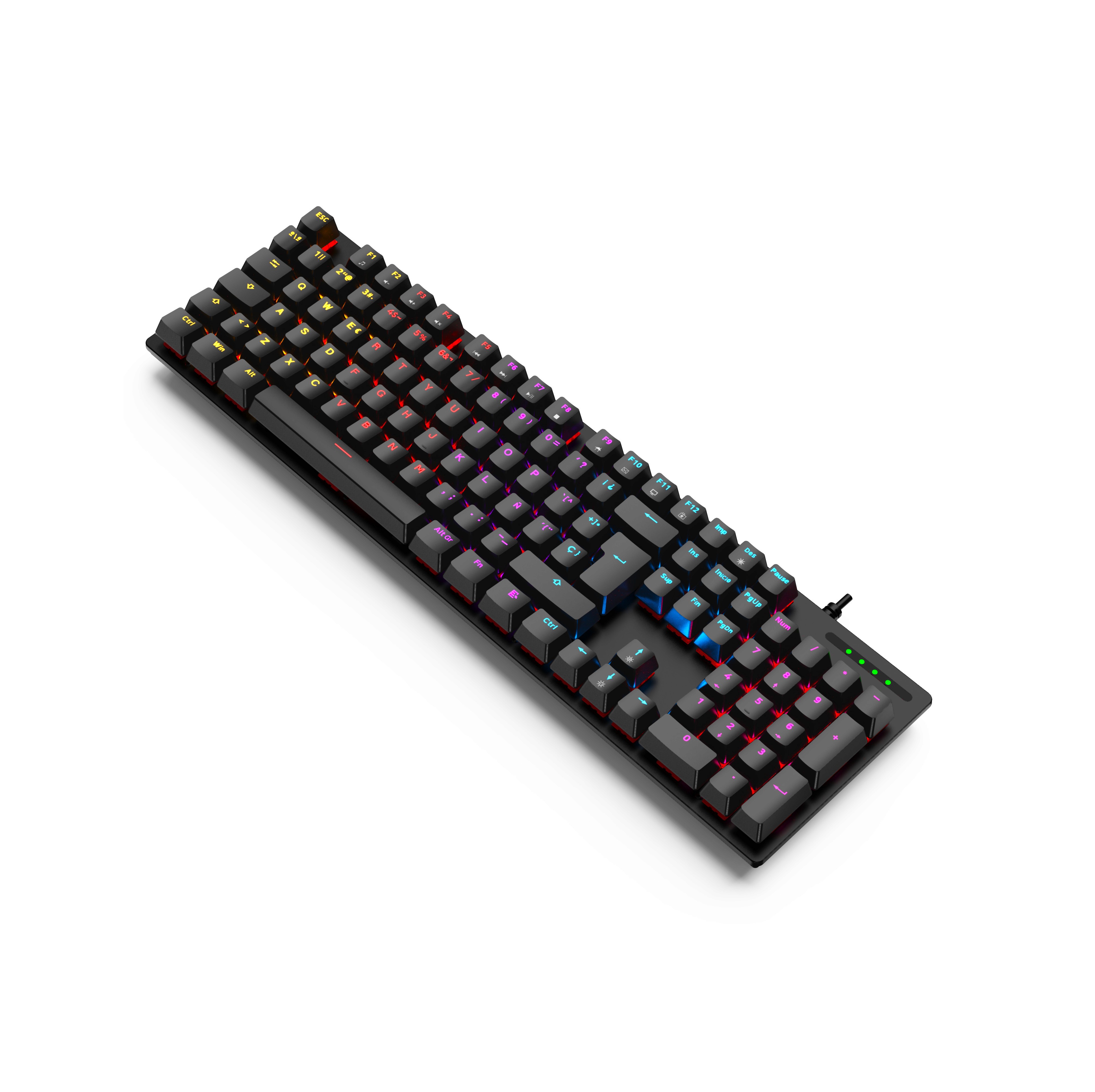 Este teclado ofrece precisión, velocidad y alto rendimiento con un diseño optimizado para el gaming. Con interruptores mecánicos (switches rojos) de respuesta rápida y retroiluminación ajustable con 17 efectos de iluminación, es la herramienta ideal para largas sesiones de juego. Su diseño robusto y teclas moldeadas por inyección de doble color aseguran robustez, máxima durabilidad y estética.